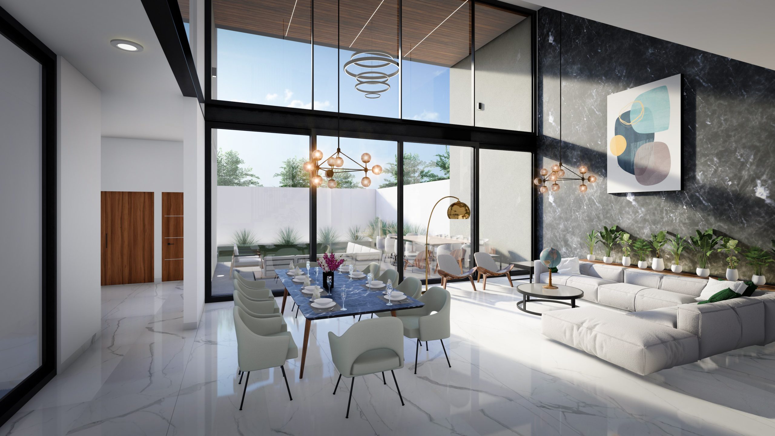 El interior los espacios son generosos y promueven la amplitud y el confort. Las áreas públicas, como la sala y el comedor principal, cuentan con dobles alturas, lo que refuerza la sensación de amplitud y elegancia. se integra acabados de lujo, combinando maderas naturales, piedras y acento en vigas metálicas, que enmarcan las líneas horizontales del proyecto y aportan una textura sofisticada al ambiente.