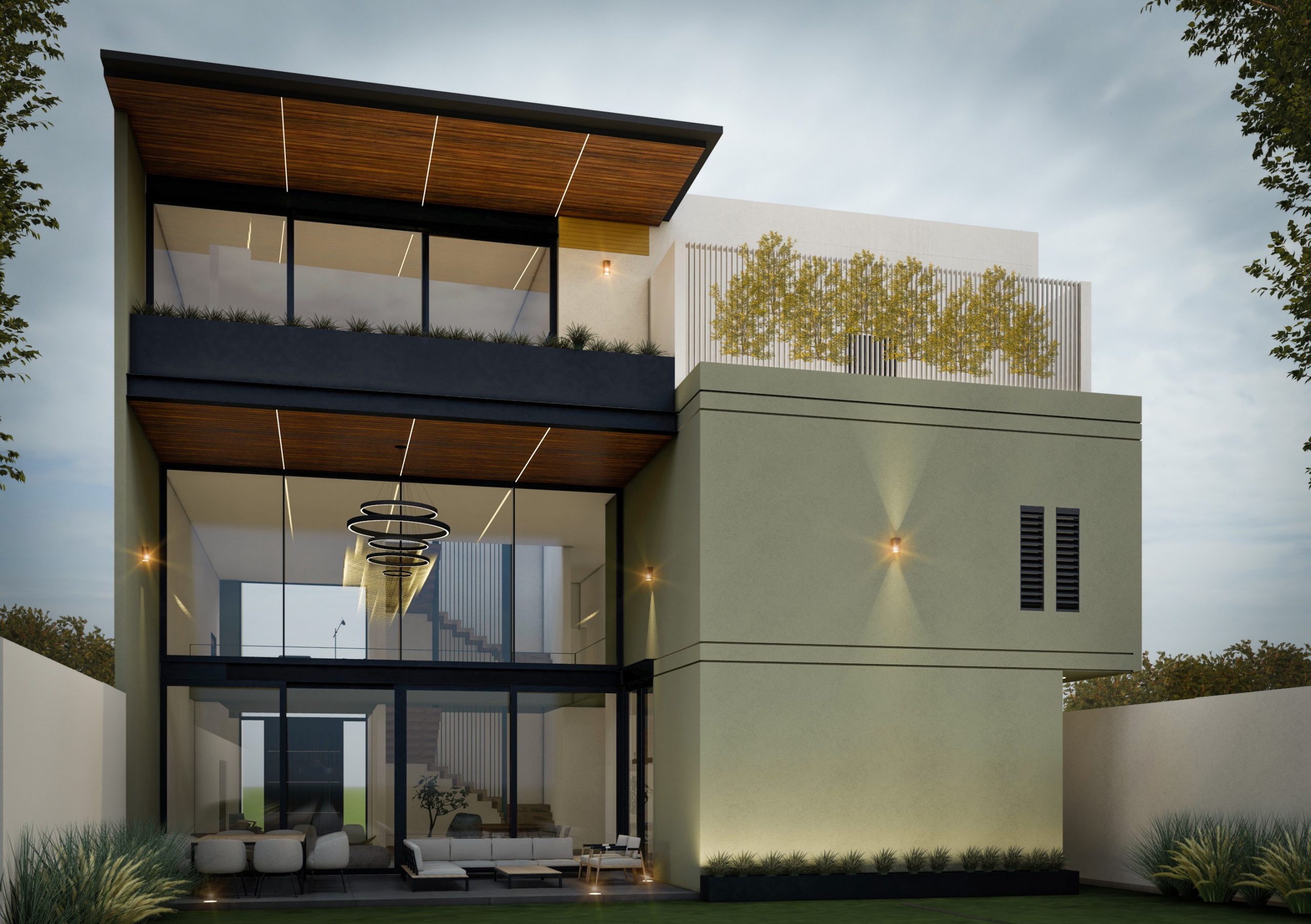 La luz se convierte en un recurso fundamental para realzar la estética, creando un dinamismo visual que varía a lo largo del día. En contraste, la fachada posterior es mucho más limpia y serena, organizada en dos volúmenes que responden a un concepto de macizo y vacío. Estos dos cubos de similares dimensiones se contraponen y generan un diálogo interesante entre ellos. Del lado derecho, el volumen macizo protege las áreas privadas, ofreciendo privacidad y resguardo, mientras que el volumen vacío del lado izquierdo permite que las áreas sociales se bañen de luz natural, favoreciendo la conexión con el exterior y creando una atmósfera luminosa y abierta.