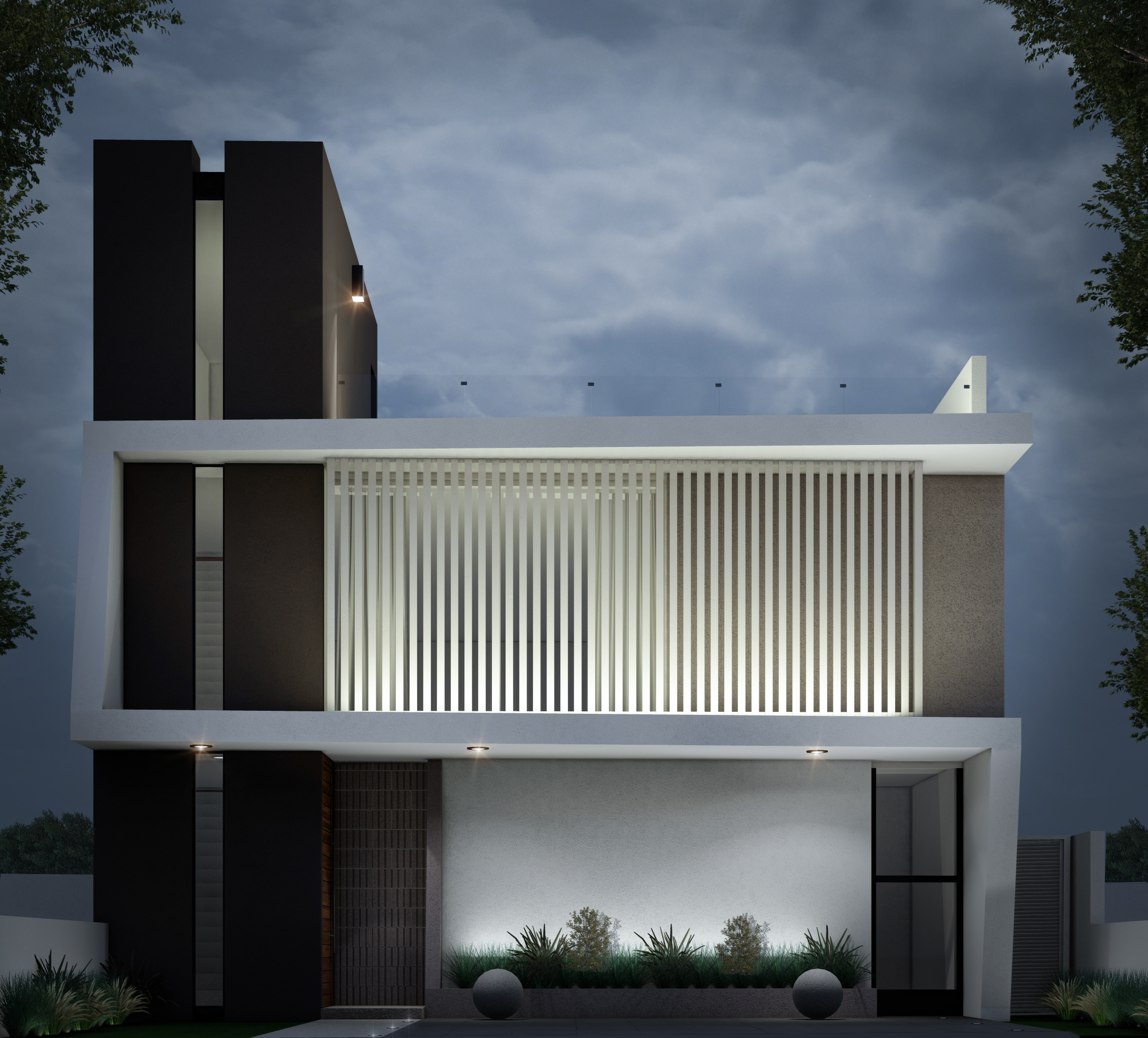 La fachada principal se caracteriza por losas flotantes y desfasadas así coom una celosía vertical no solo añaden ritmo y textura, sino que también optimizan la entrada de luz natural y la ventilación, garantizando privacidad sin comprometer la conexión con el exterior.