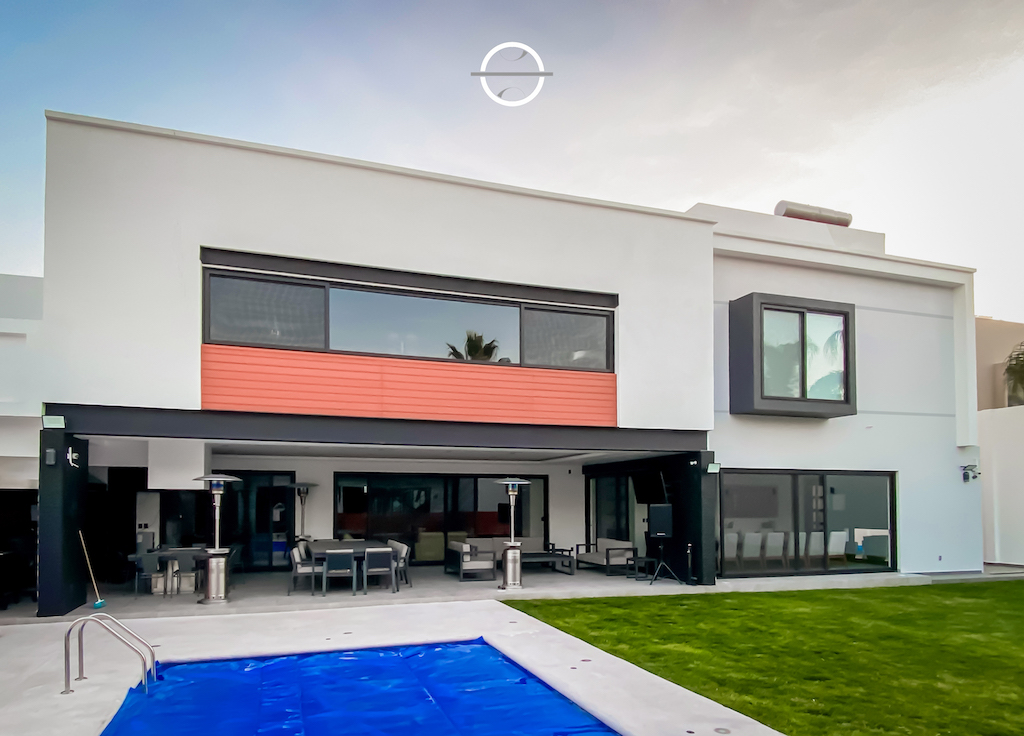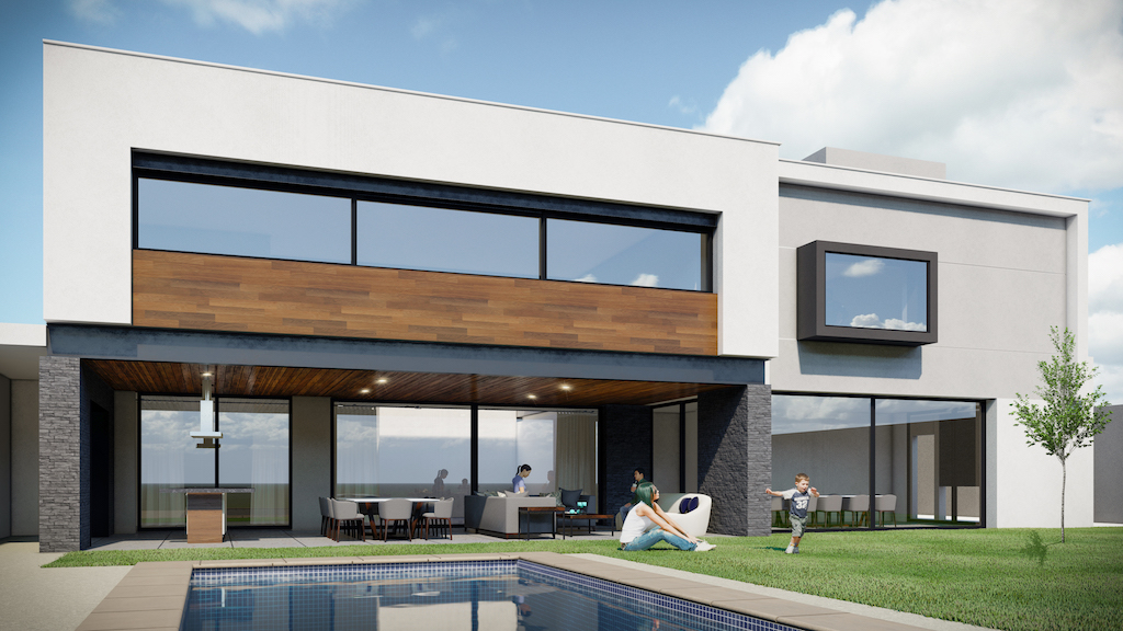 Creación de dos fachadas monumentales, con una longitud de 24 metros cada una, La fachada principal se caracteriza por la incorporación de una celosía vertical, la cual no solo actúa como un elemento compositivo que imprime carácter y identidad al conjunto, sino que también cumple una función funcional: actúa como una pantalla protectora para el patio interior, filtrando la luz y favoreciendo la privacidad sin sacrificar la conexión con el exterior. Este diseño permite un control de la luz natural, creando una atmósfera cambiante a lo largo del día, que contribuye a la percepción de la edificación. En la fachada posterior optamos por una composición más sobria y contenida. Se generaron volúmenes geométricos que responden a una estética más austera, extruyendo algunos de ellos para interrumpir la continuidad de la horizontalidad, introduciendo una dinámica visual que enriquece el recorrido y la percepción del espacio desde diferentes ángulos.